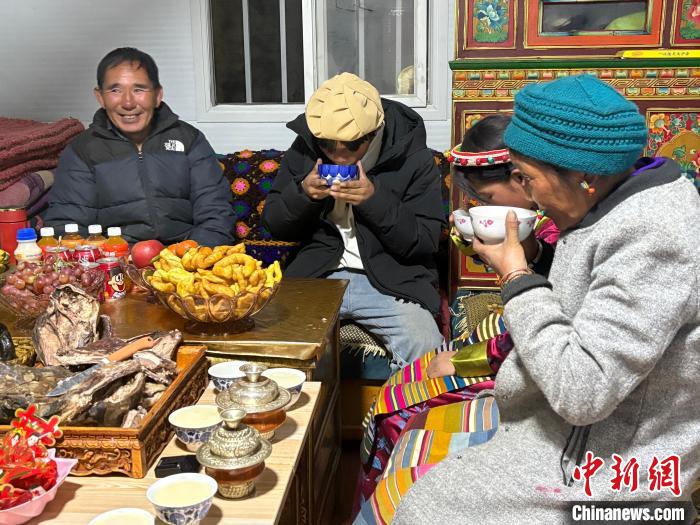 圖為日喀則市拉孜縣錫欽鄉(xiāng)錫欽村安置板房內,吳子周一家人在喝大年初一的“羌鍋”。何金龍 攝