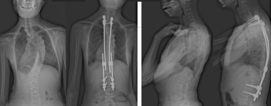 白瑪今年10歲,正在讀小學。媽媽發(fā)現(xiàn),白瑪經(jīng)常歪著肩膀,在反復提醒“站直了,別歪著”后,情況也沒有改善。近半年來,白瑪?shù)挠覀?cè)肩胛骨逐漸向后凸出。到醫(yī)院檢查后發(fā)現(xiàn),白瑪?shù)男刈荡嬖诿黠@的側(cè)凸畸形,是早發(fā)型特發(fā)性脊柱側(cè)凸。由于側(cè)凸較為嚴重,已經(jīng)失去了支具治療的機會。小白瑪才10歲,隨著身體的不斷成長,她的脊柱會越來越彎,肩膀會越來傾斜。這不僅影響體態(tài)和外觀,也可能限制心、肺等內(nèi)臟器官的發(fā)育,導致心肺功能下降、肢體活動不便,出現(xiàn)癱瘓,甚至死亡。對于白瑪這種情況,只能利用手術(shù)治療來矯正脊柱、阻止骨骼畸形進展。
