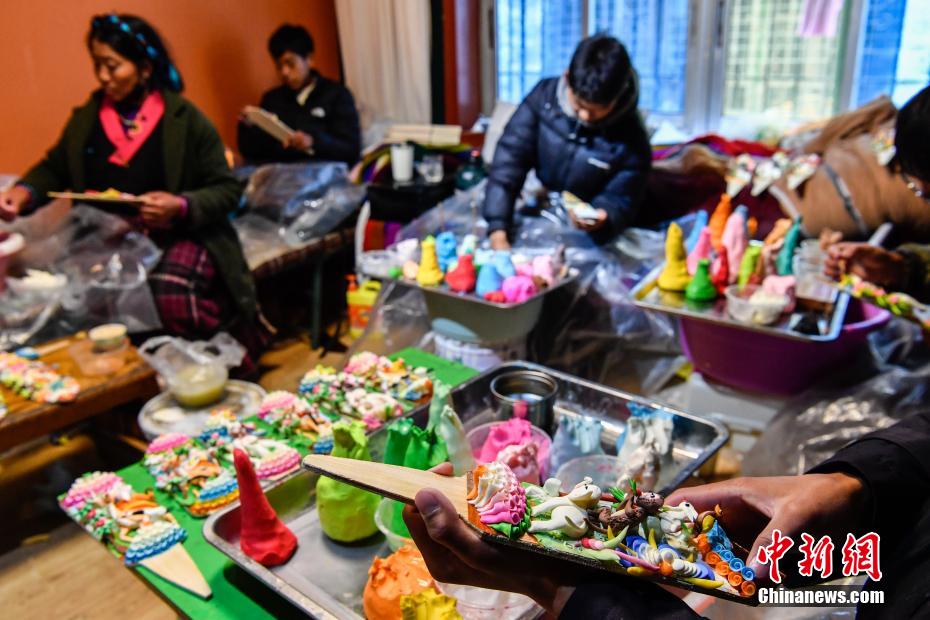 2月15日,手工藝人在拉薩制作酥油花。隨著藏歷新年臨近,酥油花在拉薩年貨市場上熱銷。酥油花在藏語中稱為“孜扎”,是藏族民眾家庭中必備的年貨之一。