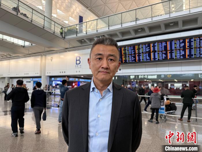 2月19日,西藏航空“拉薩-成都天府-香港”航線(xiàn)開(kāi)通。圖為西藏航空副總經(jīng)理張兵兵在香港國(guó)際機(jī)場(chǎng)抵港大堂接受中新社記者采訪(fǎng)。中新社記者 韓星童 攝