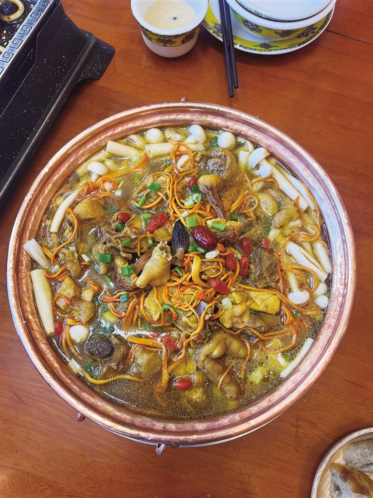 傳統(tǒng)的藏式牦牛肉火鍋講究原汁原味,湯底通常選用牦牛骨熬制數(shù)小時(shí),加入少許鹽和香料即可。鍋底先鋪上一層時(shí)蔬和粉絲,再鋪一層牦牛肉排,最上面是土豆、蘿卜、白菜、青筍、木耳等耐煮的蔬菜,再加上肥瘦相間的新鮮牦牛肉慢慢燉煮。各類食材的香味相互碰撞,別提多香了!為了不掩蓋食物本身的香氣,藏式牦牛肉火鍋的蘸料通常比較簡(jiǎn)單,可以用辣椒醬、蔥花、香菜等調(diào)制,也可以根據(jù)個(gè)人喜好加入芝麻醬、腐乳等。牦牛肉火鍋味道濃郁,建議搭配清淡的酥油茶或甜茶等飲品。