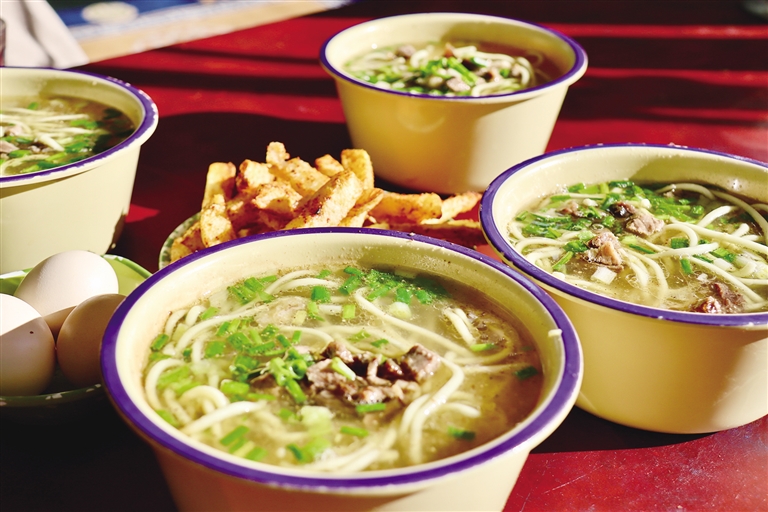 在西藏,人們總能將簡(jiǎn)單的食材做出獨(dú)一無(wú)二的“西藏味道”。一壺甜茶,一碗藏面,一份炸土豆或肉餅,便是這里最標(biāo)準(zhǔn)的早餐套餐。清水、紅茶茶葉、甜奶粉或牦牛奶,只需簡(jiǎn)單的食材,便能制作出茶香濃郁、奶味醇厚的甜茶。在略帶寒意的初春,喝上一口,整個(gè)身子都暖了起來(lái)。此時(shí)搭配一碗筋道的藏面,簡(jiǎn)單又滿足。