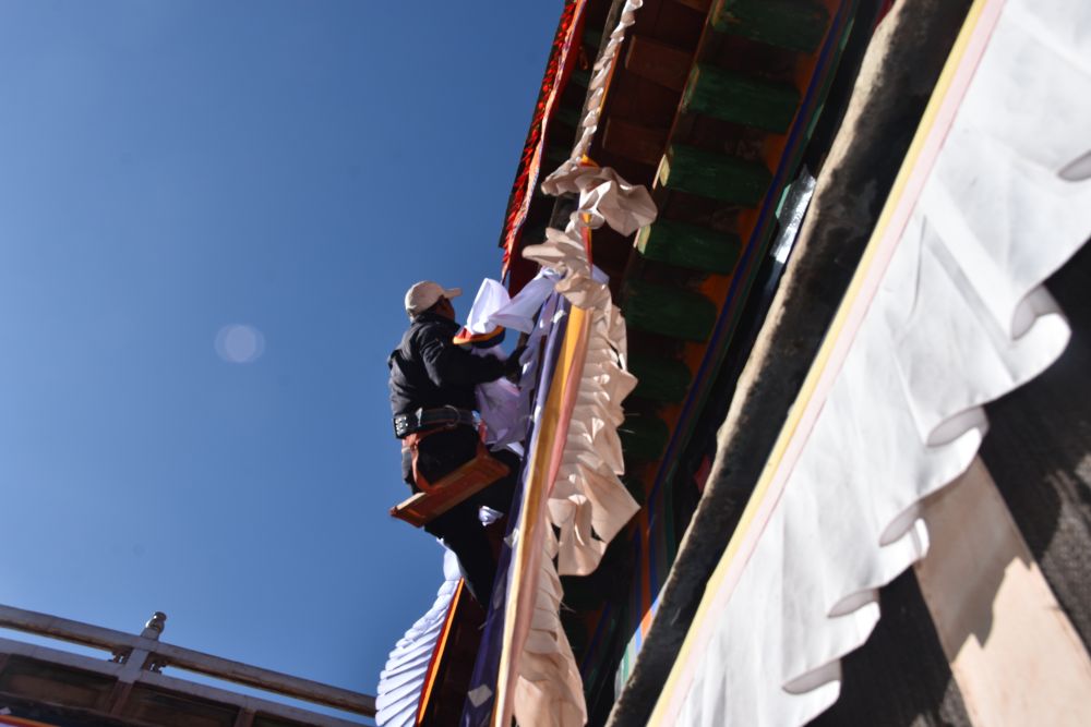 2月28日是藏歷木蛇新年。隨著春天的腳步將近,布達(dá)拉宮迎來(lái)這場(chǎng)特別的“換裝”儀式——更換“香布”。“香布”是藏式建筑的裝飾,通常用五彩棉布縫制,主體為白色,搭配紅藍(lán)黃等色的邊沿,對(duì)窗沿等的顏料及木構(gòu)件起到保護(hù)作用。