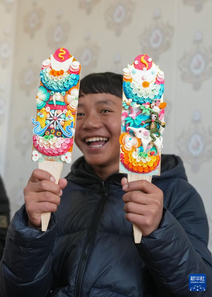 在拉薩市老城區(qū),小學(xué)徒在展示剛剛做好的一對(duì)酥油花(2月25日攝)。新華社記者 晉美多吉 攝