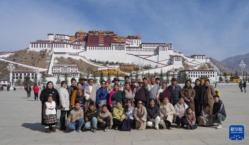 2月28日,來自西藏那曲市比如縣的一家人在拉薩布達拉宮前合影留念。新華社記者 晉美多吉 攝