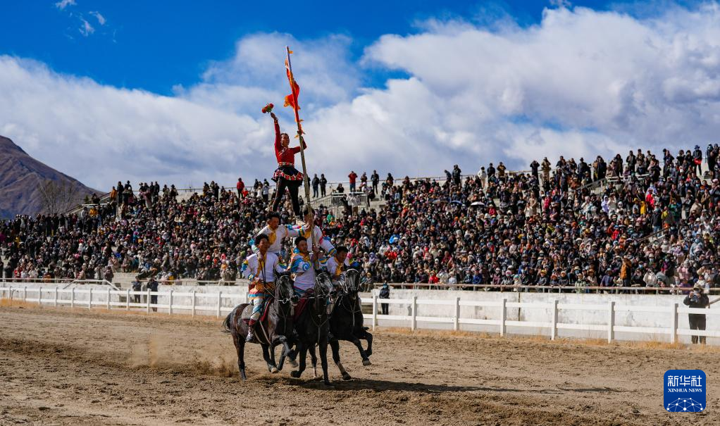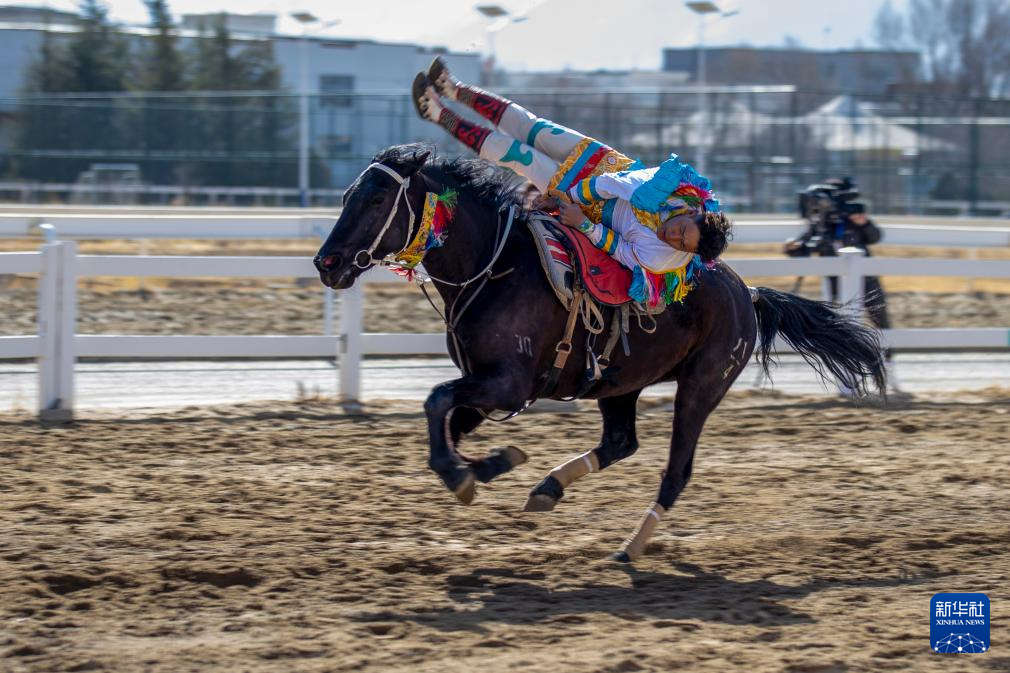 3月2日,馬術(shù)隊員在表演傳統(tǒng)馬術(shù)項目。新華社記者 晉美多吉 攝