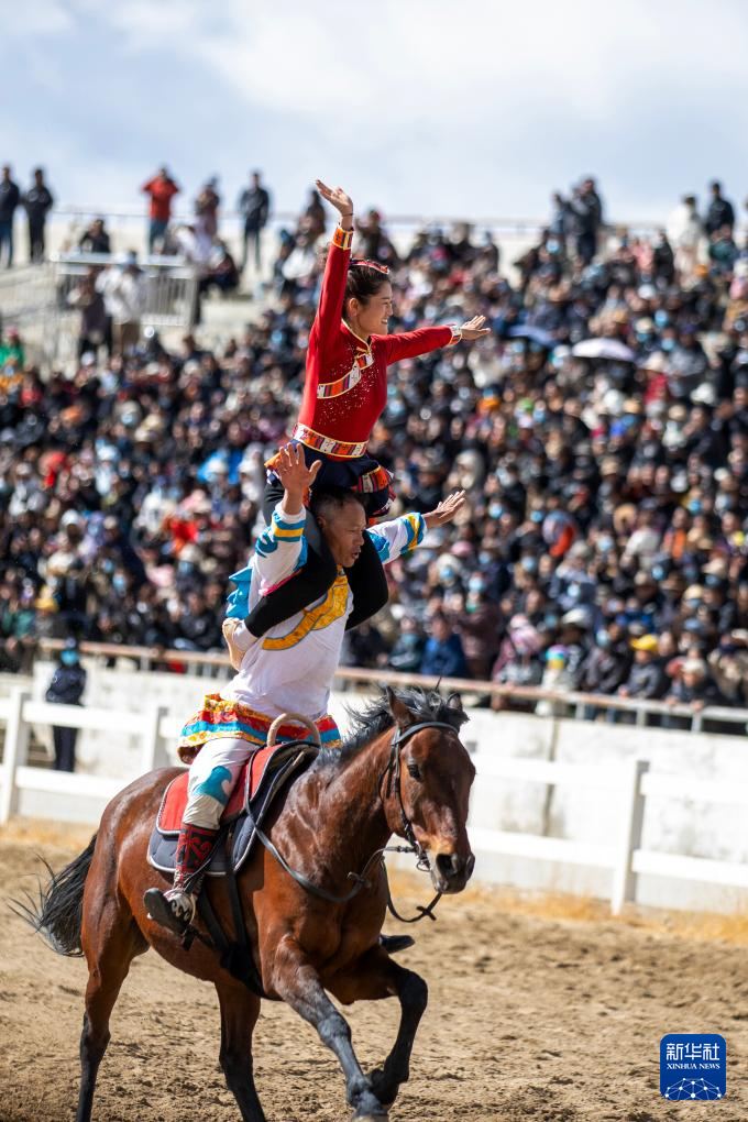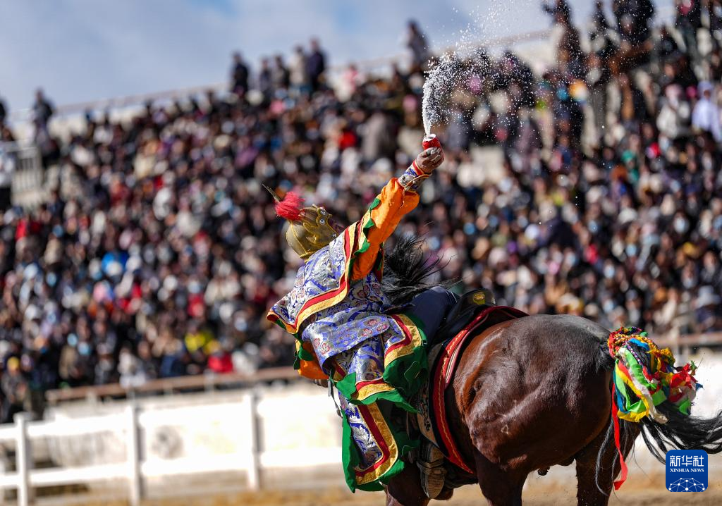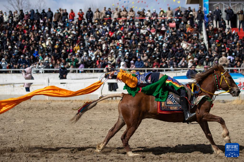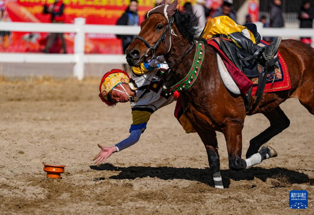 3月2日,馬術(shù)隊員在表演傳統(tǒng)馬術(shù)項目撿哈達(dá)。新華社記者 晉美多吉 攝