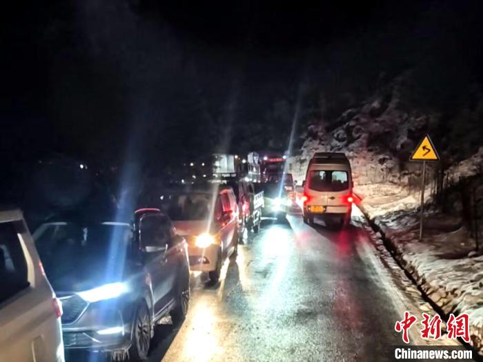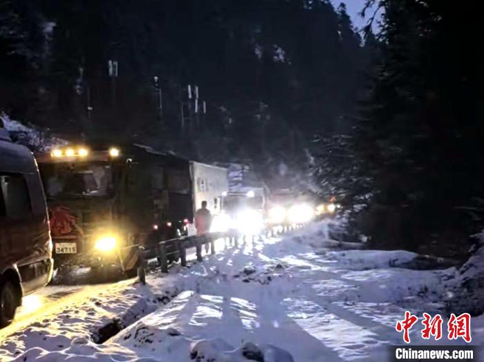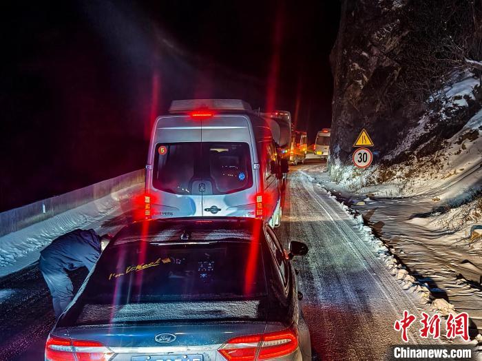 當(dāng)夜幕降臨之時,大風(fēng)夾著雪粒呼嘯不止,山上的氣溫也越來越低,部分司乘人員出現(xiàn)焦慮,官兵們一邊耐心地安撫司乘人員焦急的情緒,一邊有條不紊地指揮車輛緩緩挪動。