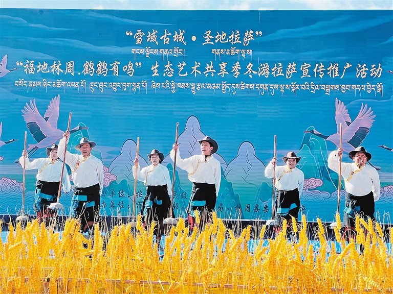 當(dāng)溫暖的陽光輕柔地灑在拉薩河谷,黑頸鶴清脆的鳴叫聲喚醒了林周濕地寧靜的清晨?!案5亓种堋Q鶴有鳴”生態(tài)藝術(shù)共享季之“冬游拉薩”宣傳推廣活動,以歌舞表演、生態(tài)主旨演講、黑頸鶴攝影作品展、鶴文化專家座談等,融合了生態(tài)、藝術(shù)與文化的盛宴,讓人在雪山、湖泊與鶴影交織的詩意中,感受“冬游拉薩”的獨(dú)特魅力。