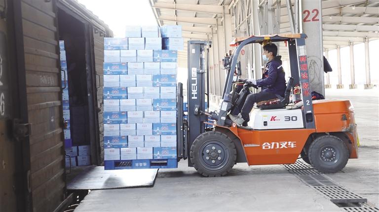 工作人員將礦泉水運(yùn)到火車上。 文/圖 通訊員 周悅翔 馮燕燕 其美卓嘎 記者 張雪芳