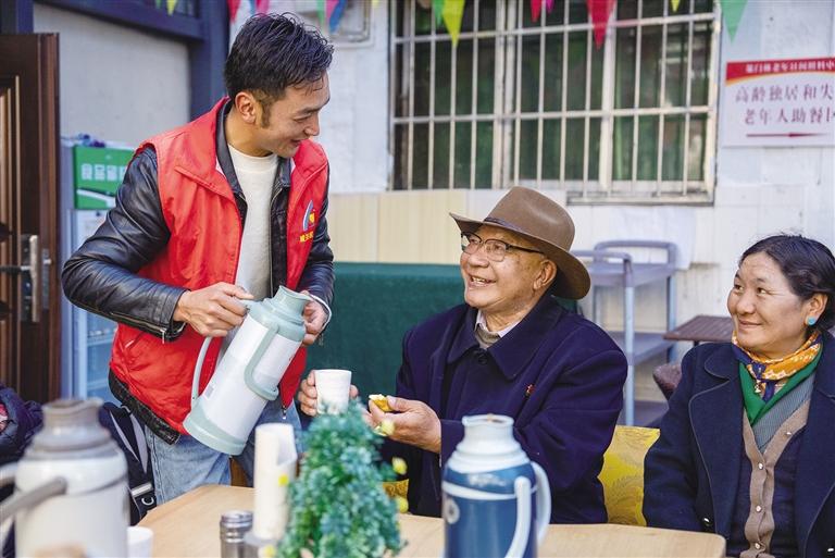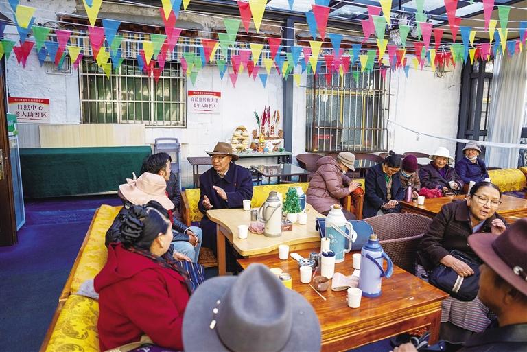 “波啦,您來啦,快坐下來喝點熱茶?!薄澳玻龝顼堅谶@邊吃嗎?”近日,記者來到拉薩市城關(guān)區(qū)蕃陽社會工作者和志愿者服務(wù)協(xié)會下的策門林老年日間照料中心,剛進大門就被一群正在鍛煉身體的老人所吸引。他們跟著老師抬手、踢腿、扭腰,動作整齊劃一,臉上洋溢著幸福的笑容。鍛煉結(jié)束后,赤來回到助餐區(qū),邊喝甜茶邊吃“卡賽”,和老人們分享趣聞,拉著家常,現(xiàn)場傳來一陣陣歡聲笑語。