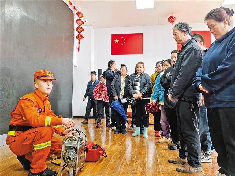 圖為消防員向當(dāng)?shù)厝罕娭v解消防器材的使用方法。記者 楊小娟 通訊員 蔡安 攝