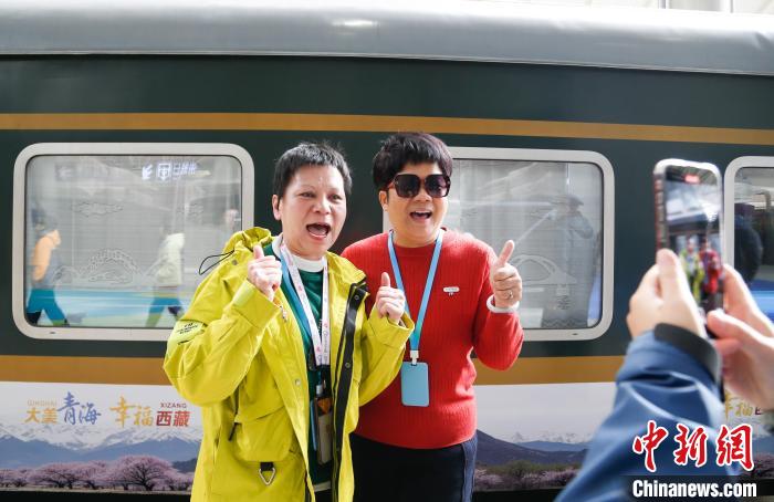 3月26日,乘坐青海首趟直達西藏林芝旅游專列的旅客與列車合影留念?!●R銘言 攝