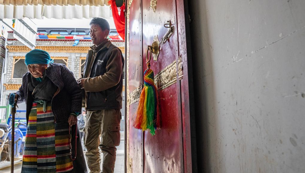 孫子照看著玉珍奶奶回屋(3月12日攝)。新華社記者 丁增尼達(dá) 攝