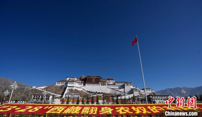 圖為3月28日,西藏布達拉宮廣場擺放西藏百萬農(nóng)奴解放紀(jì)念日標(biāo)語。李林 攝