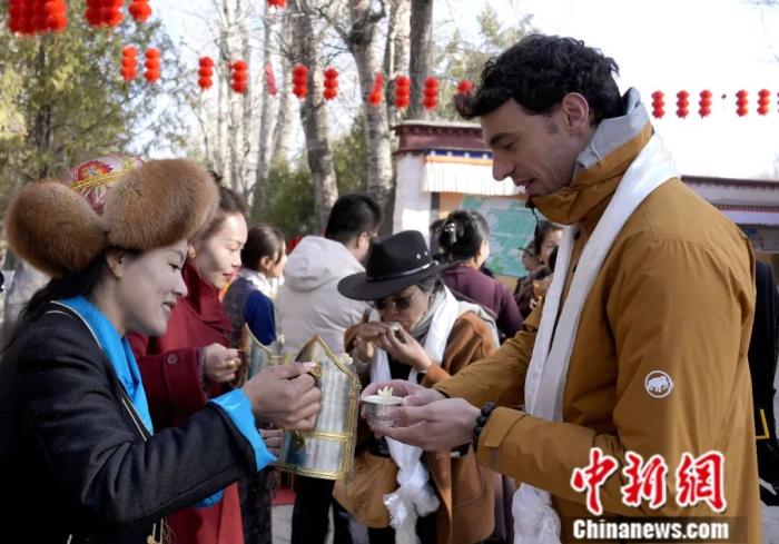 2025年2月28日是2025年藏歷木蛇新年的第一天。圖為外國游客在西藏拉薩市羅布林卡內(nèi)品嘗青稞酒。中新社記者 李林 攝