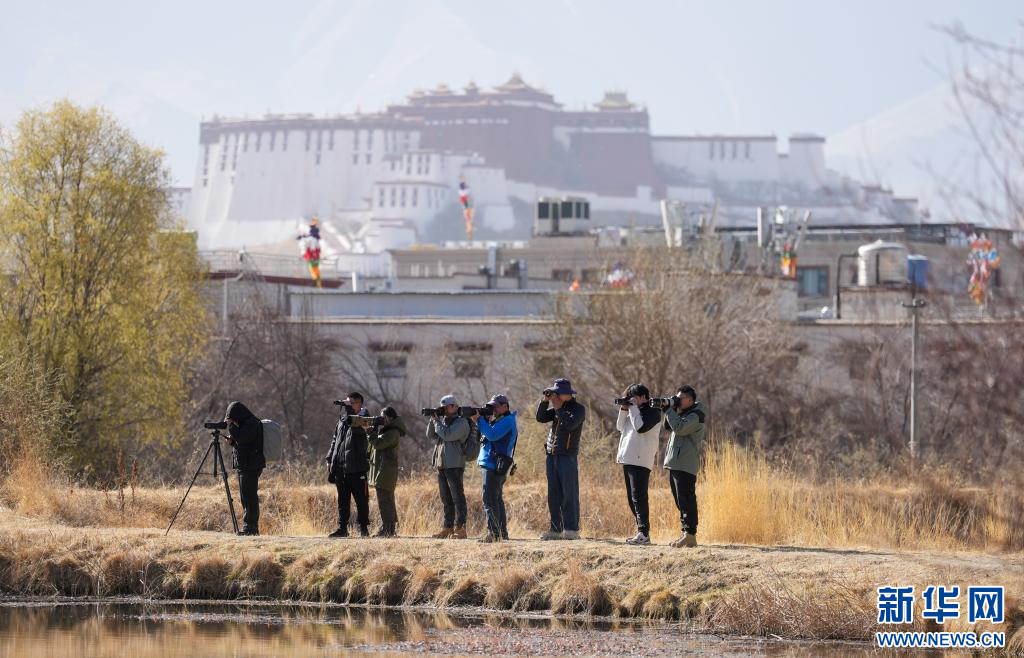 3月29日,參加采風(fēng)活動(dòng)的成員在拉魯濕地觀鳥拍照。新華社記者 晉美多吉 攝