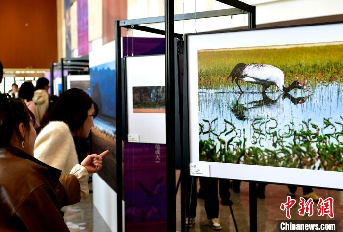 圖為觀眾拍攝黑頸鶴主題攝影展中的作品。李林 攝