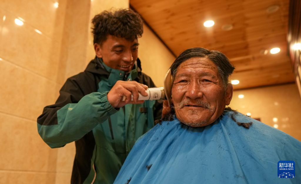 4月25日,那曲市色尼區(qū)老年人日間照料中心的工作人員為老人理發(fā)。新華社記者 晉美多吉 攝