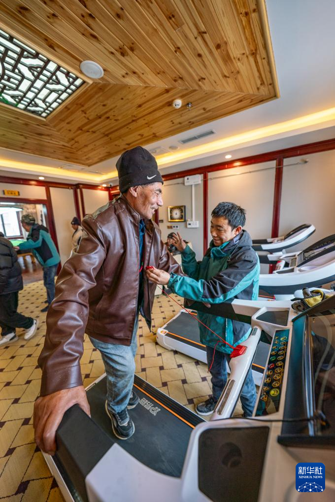 4月25日,在那曲市色尼區(qū)老年人日間照料中心,工作人員陪同老人在跑步機(jī)上做運(yùn)動(dòng)。新華社記者 丁增尼達(dá) 攝