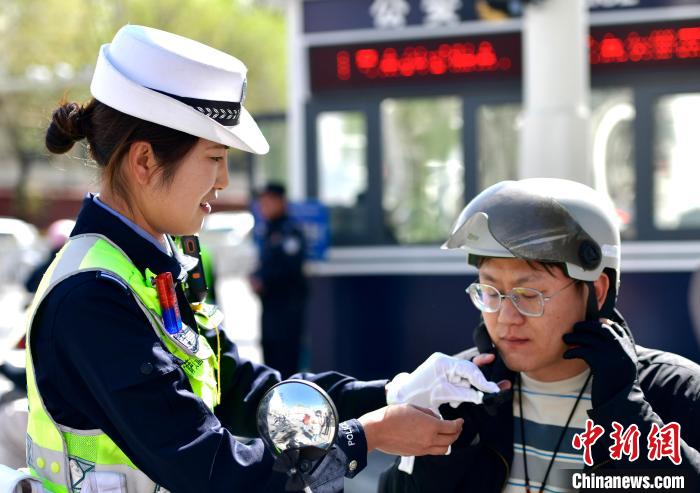 圖為拉薩市公安局交警支隊(duì)城北大隊(duì)副大隊(duì)長(zhǎng)胡花芳為駕駛員調(diào)節(jié)頭盔。李林 攝