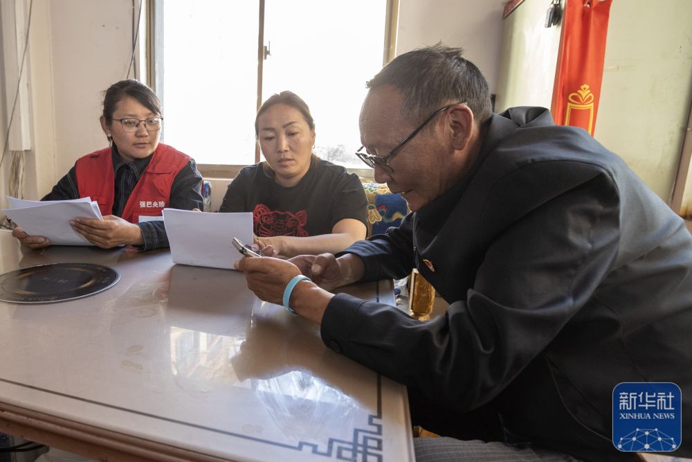 尼瑪(右一)與防汛工作人員一起巡查村中水道(4月24日攝)。