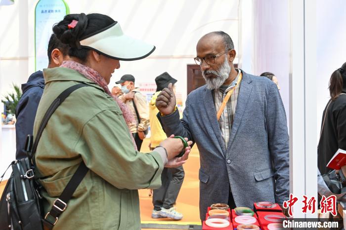 圖為拉薩進(jìn)口商品展覽會(huì)現(xiàn)場(chǎng),巴基斯坦商人(右)向顧客介紹、推銷手鐲。中新社記者 貢嘎來松 攝