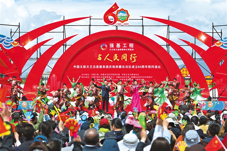 上午10時整,“與人民同行”中國文聯(lián)文藝志愿服務(wù)團慶祝西藏自治區(qū)成立60周年慰問演出,在歌舞《鼓舞西藏》的熱烈氛圍中正式開場。