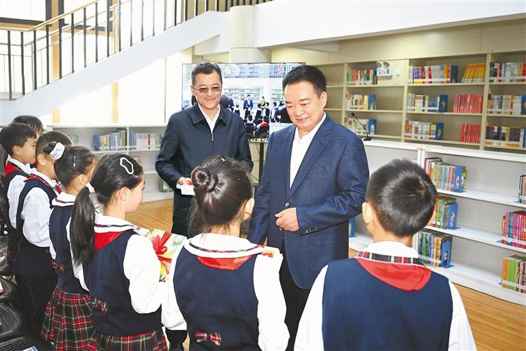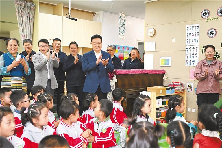 初夏,萬物并秀,生機勃發(fā),拉薩市實驗小學(xué)書聲瑯瑯。王君正走進校園,察看學(xué)校環(huán)境,參觀自然、閱讀、書法、體育等教育成果展示,了解學(xué)校歷史沿革、建設(shè)發(fā)展、教育教學(xué)等情況。他指出,習(xí)近平總書記高度重視、親切關(guān)懷少年兒童和少先隊工作,多次參加少先隊活動,發(fā)表重要講話、作出重要指示。5月27日,習(xí)近平總書記致信祝賀中國少年先鋒隊第九次全國代表大會召開,殷切寄語廣大少年兒童,飽含著對大家的深切關(guān)愛。要加強愛國主義教育,講好思政課,著力講好黨的故事、革命的故事、英雄的故事,時刻把祖國和人民放在心中,不忘初心、童心向黨,從小聽黨話、感黨恩、跟黨走;要積極推廣國家通用語言文字,把鑄牢中華民族共同體意識根植少年兒童心靈深處,引導(dǎo)他們爭做民族團結(jié)的小石榴籽,爭當(dāng)學(xué)習(xí)和踐行社會主義核心價值觀的小模范。圖書館內(nèi),“紅領(lǐng)巾小書蟲”讀書分享活動正在進行,孩子們圍坐在一起,與定日縣長所鄉(xiāng)完全小學(xué)學(xué)生視頻連線,共同分享喜歡的書籍,王君正認真傾聽、親切詢問,向孩子們贈送書籍?!白鎳奈磥砗拖M谀銈兩砩?,要熱愛祖國、好好學(xué)習(xí)、天天向上,從小培養(yǎng)良好的道德情操?!蓖蹙膭钏麄冋f,要多讀書、讀好書,從書中汲取智慧和營養(yǎng),將來做對國家、對人民、對社會有用的人。