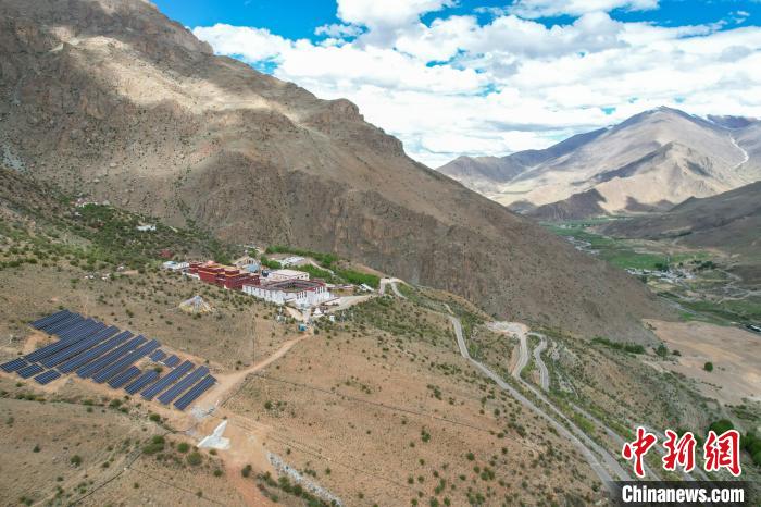 5月29日,航拍拉薩乃朗寺光伏電站,該電站年發(fā)電量約100萬(wàn)千瓦時(shí),并配備光儲(chǔ)充一體化系統(tǒng),可完全滿足寺廟的使用需求。(無(wú)人機(jī)畫(huà)面)中新社記者 江飛波 攝