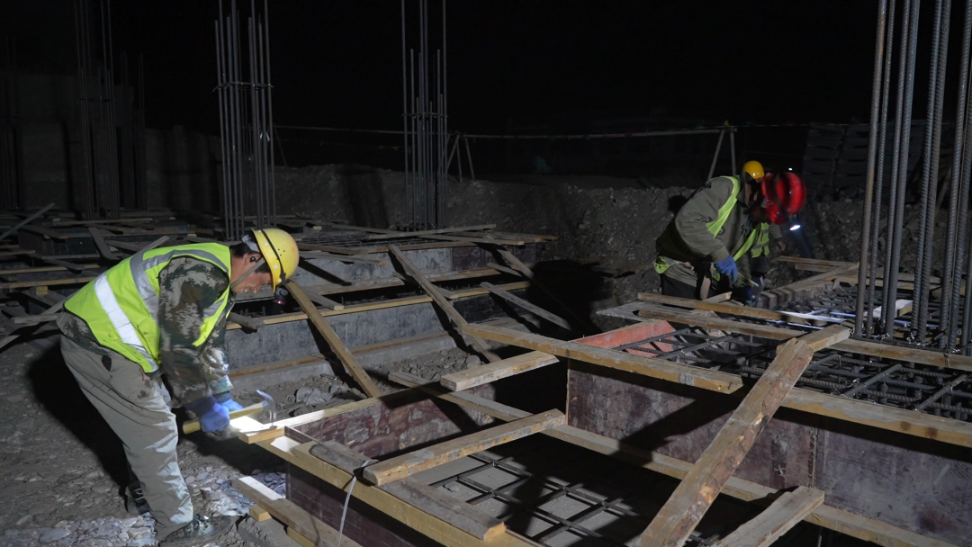 當(dāng)夜幕籠罩村莊,大風(fēng)呼嘯,旺加仍未歸家。他戴上安全帽,出現(xiàn)在燈火通明的工地。機(jī)械轟鳴,人聲交織。旺加仔細(xì)巡視基坑、鋼筋,履行監(jiān)督之責(zé);順手遞工具,用帶著藏語腔調(diào)的漢語講著接地氣的笑話驅(qū)散疲憊。
