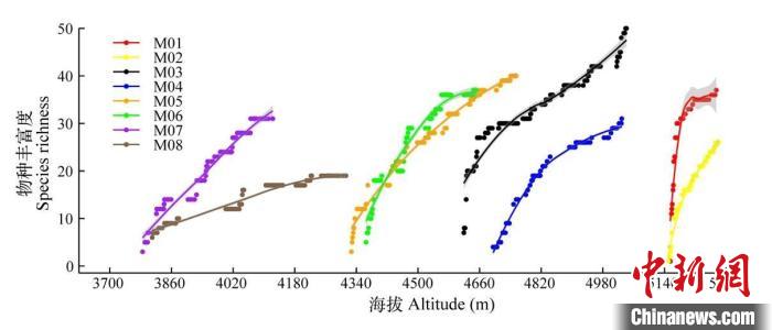 珠峰絨布河流域各個山體累計物種豐富度沿海拔高度的變化。M01–M08表示絨布河上游到下游所調(diào)查的8個獨立山體。中國科學(xué)院青藏高原研究所 供圖