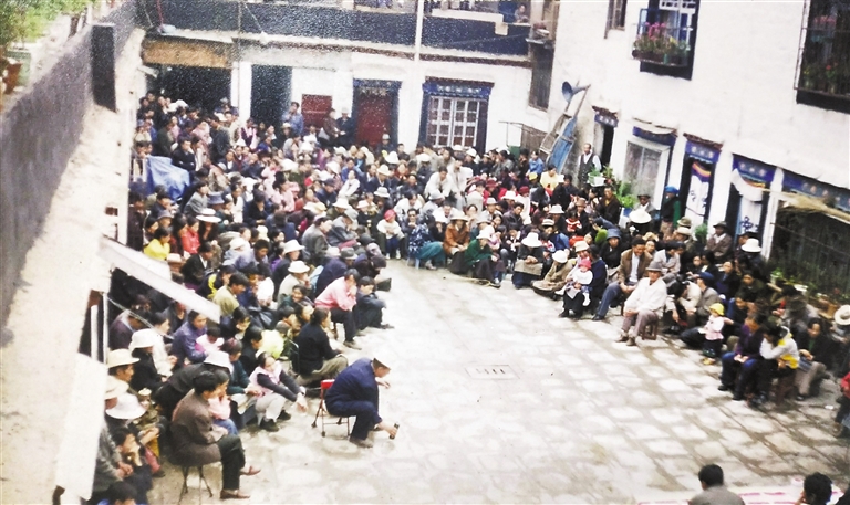 在當(dāng)時(shí)拍的另一張照片上,幾十位居民擠在過道里準(zhǔn)備投票?!澳菚r(shí)候院子小,選舉時(shí)得側(cè)著身子站。”德吉卓嘎回憶道,“院子窄小,雨天積水,但絲毫不影響大家參與社區(qū)事務(wù)的熱情。”照片的一角,13歲的普布普赤正躲在母親身后好奇張望,如今她41歲,已成長(zhǎng)為大院的戶長(zhǎng)。