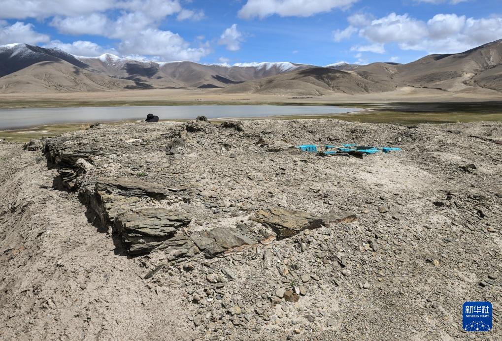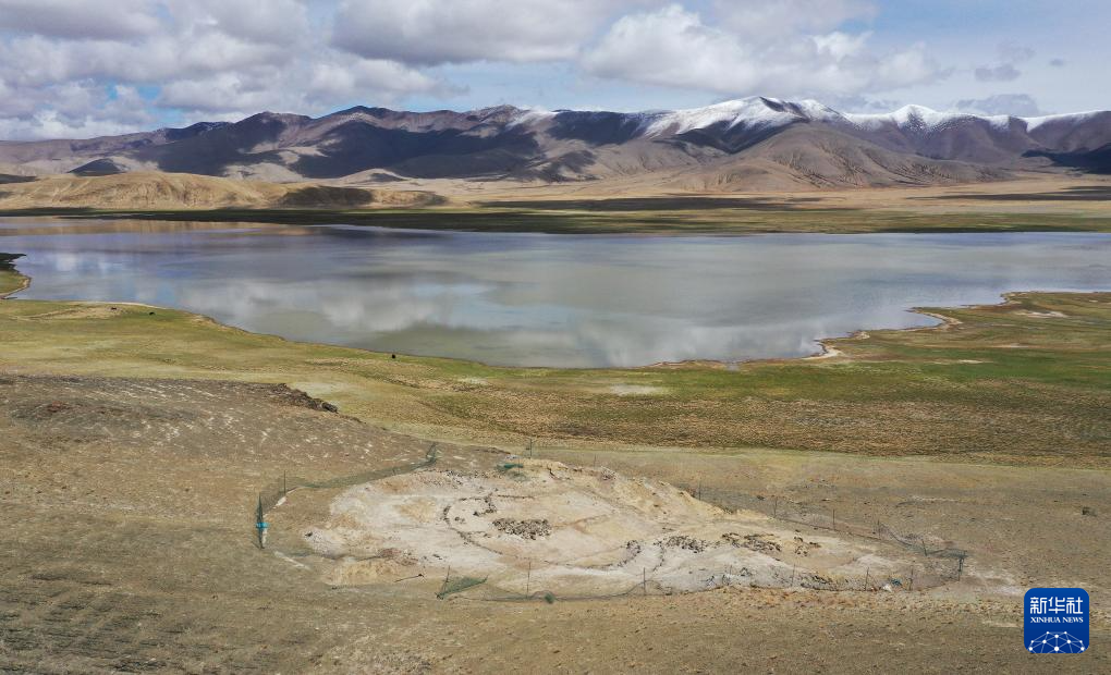 這是5月22日拍攝的坐落在瑪不錯(cuò)湖畔的遺址第四期石構(gòu)地面建筑考古發(fā)掘現(xiàn)場(chǎng)(無人機(jī)照片)。新華社記者 李賀 攝