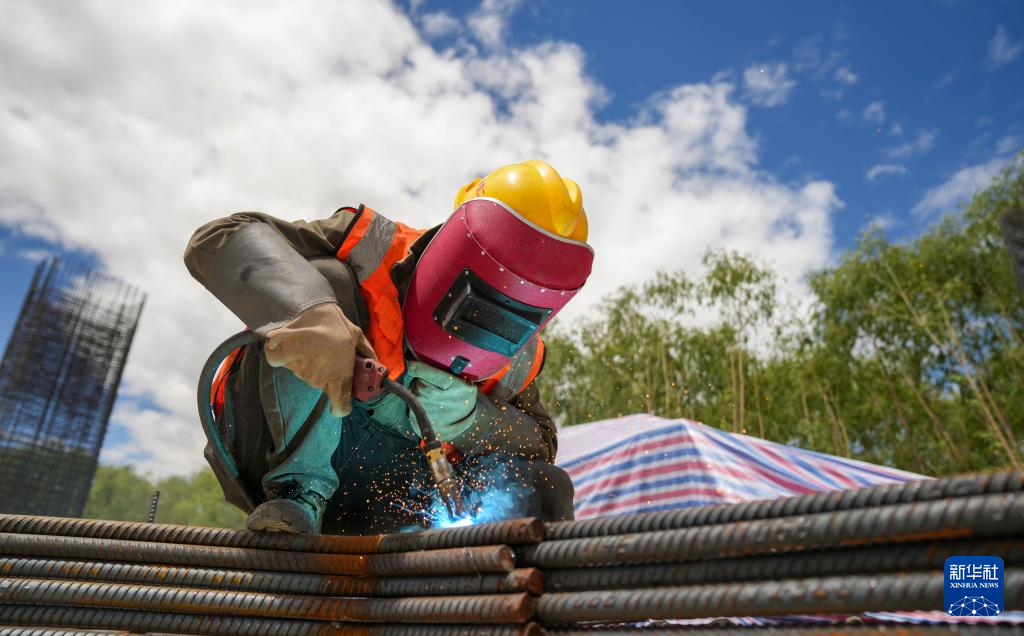 工人在薩熱路跨江大橋建設(shè)現(xiàn)場(chǎng)焊接鋼筋(6月18日攝)。新華社記者 晉美多吉 攝