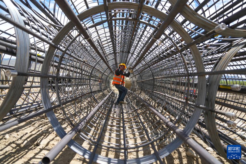 工人在薩熱路跨江大橋建設(shè)現(xiàn)場(chǎng)綁扎聲測(cè)管(6月18日攝)。新華社記者 晉美多吉 攝
