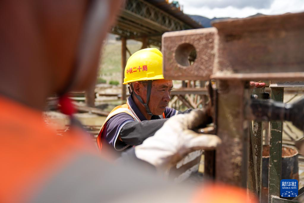工人在薩熱路跨江大橋建設(shè)現(xiàn)場(chǎng)拼裝支撐架(6月18日攝)。新華社記者 晉美多吉 攝