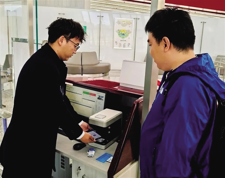 機(jī)場工作人員為游客辦理登機(jī)手續(xù)。