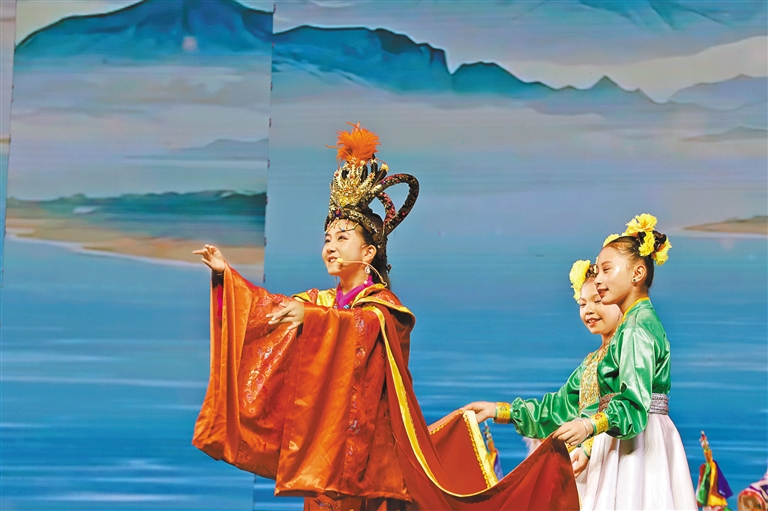 舞臺中央,12歲的其美卓嘎身著錦繡華服,以清亮唱腔和靈動演繹,將文成公主的溫婉堅毅展現(xiàn)得淋漓盡致?!爱斘掖┥蠎蚍?、唱起‘漢藏情誼潔如璧’時,仿佛真的穿越到千年前的和親之路?!毖莩鼋Y束后,小姑娘眼中閃爍著興奮的光芒,“原來民族團結的故事,就藏在這些古老而動人的戲文里?!逼涓赣H倫珠難掩自豪:“文成公主促進了漢藏交融,女兒能表演這個節(jié)目,用藏戲詮釋民族團結,是我們全家的驕傲!”