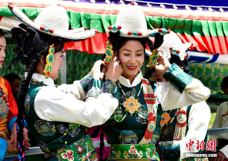 6月28日,拉薩首屆林卡囊瑪堆諧大賽在達(dá)孜區(qū)舉辦?,F(xiàn)場(chǎng),經(jīng)過(guò)前期海選入圍的19支隊(duì)伍依次上臺(tái)競(jìng)技。囊瑪和堆諧,合稱囊瑪堆諧,是西藏民間歌舞發(fā)展到較高層次、集歌舞樂(lè)為一體的珍貴傳統(tǒng)文化藝術(shù)遺產(chǎn),深受當(dāng)?shù)孛癖姷南矏?ài)與追捧。圖為首屆林卡囊瑪堆諧大賽比賽現(xiàn)場(chǎng),參賽隊(duì)伍正在整理妝容。