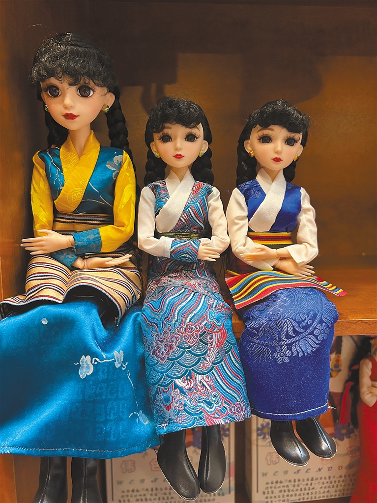 當(dāng)行至二樓文創(chuàng)區(qū),一隅活力景象,驟然點亮歷史的深沉,一排排“拉颯姑娘”布娃娃,身著華麗藏裝靜靜佇立,吸引游客駐足流連。