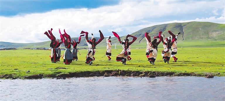 近年來,那曲文旅局以那曲傳統(tǒng)鍋莊舞展演為突破口,進一步推進那曲優(yōu)秀傳統(tǒng)文化創(chuàng)造性轉(zhuǎn)化和創(chuàng)新性發(fā)展,全力打響那曲鍋莊舞品牌?!D為那曲市群眾藝術(shù)鍋莊隊隊員在草原上跳鍋莊舞。(那曲市文旅局非遺處提供)