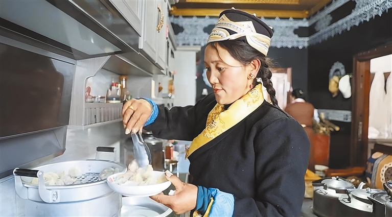 圖為朗縣拉丁雪村村民堅(jiān)阿措姆在嶄新的廚房里忙著盛裝熱氣騰騰的牛肉包子。記者 謝筱純 攝