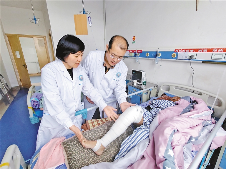 青島市市立醫(yī)院援藏醫(yī)生徐文龍(右)指導(dǎo)患者進(jìn)行術(shù)后康復(fù)訓(xùn)練。青島援藏干部王建亮提供