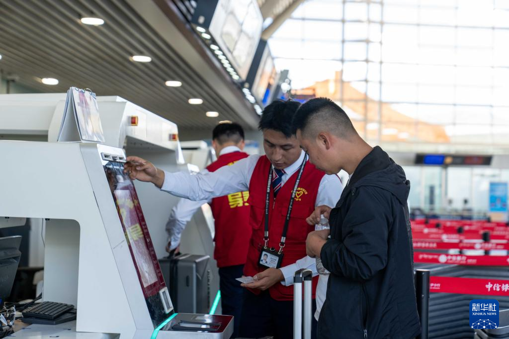 7月18日,拉薩貢嘎國際機場工作人員在幫旅客辦理行李托運手續(xù)。新華社記者 旦增尼瑪曲珠 攝