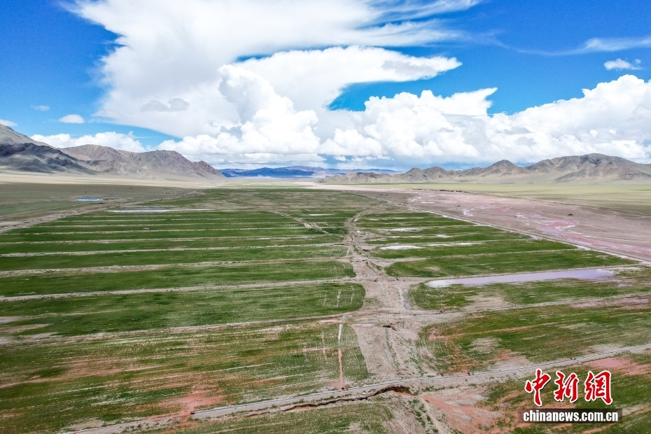 7月20日,航拍西藏阿里地區(qū)革吉縣文布當(dāng)桑鄉(xiāng)的人工種草基地。為解決當(dāng)?shù)囟旧笥貌堇щy,減輕天然草場(chǎng)壓力,2016年起文布當(dāng)桑鄉(xiāng)規(guī)劃建設(shè)人工種草基地。截至2024年,已種植人工草場(chǎng)3590畝,草業(yè)收入229.3萬(wàn)元人民幣,有效帶動(dòng)當(dāng)?shù)剞r(nóng)牧民就業(yè)創(chuàng)收和推動(dòng)生態(tài)可持續(xù)發(fā)展。(無(wú)人機(jī)照片)中新社記者 張祥毅 攝