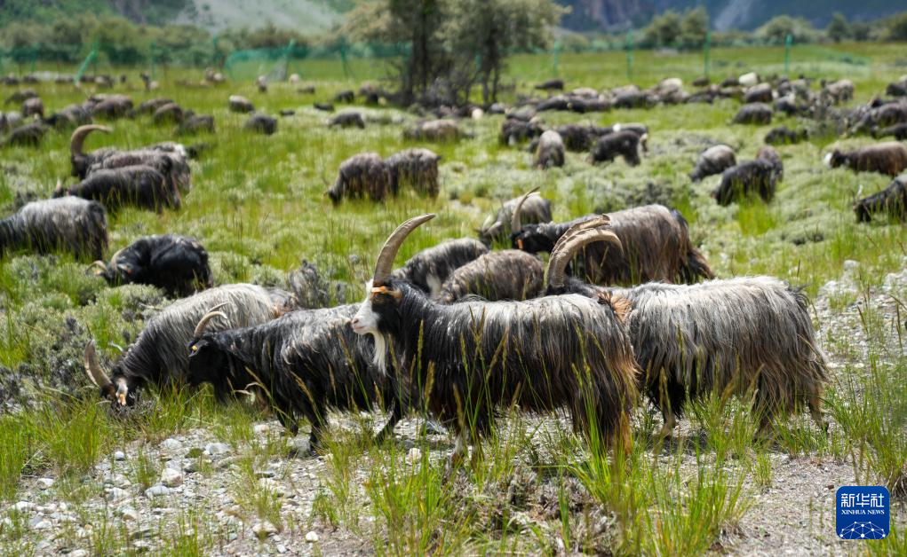 散養(yǎng)在邊壩縣黑山羊養(yǎng)殖基地周邊草地上的邊壩黑山羊(7月20日攝)。新華社記者 晉美多吉 攝