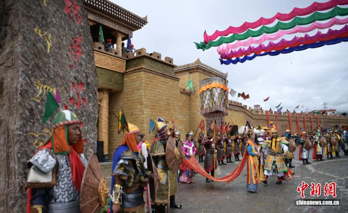 2019年9月16日,四川甘孜縣格薩爾王城暨百村產(chǎn)業(yè)基地舉行開城儀式,城內(nèi)以格薩爾故事打造的景觀小品體驗地有1000余處,游客可聽《格薩爾》說唱、看《格薩爾》藏戲等。中新社記者 劉忠俊 攝