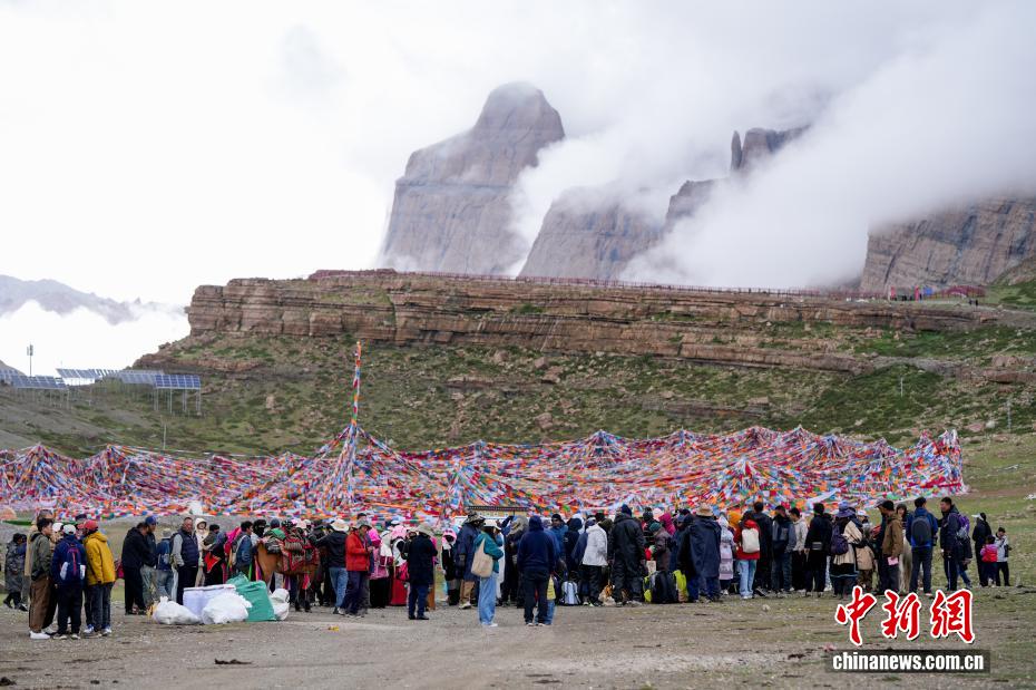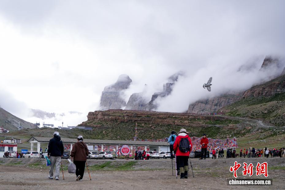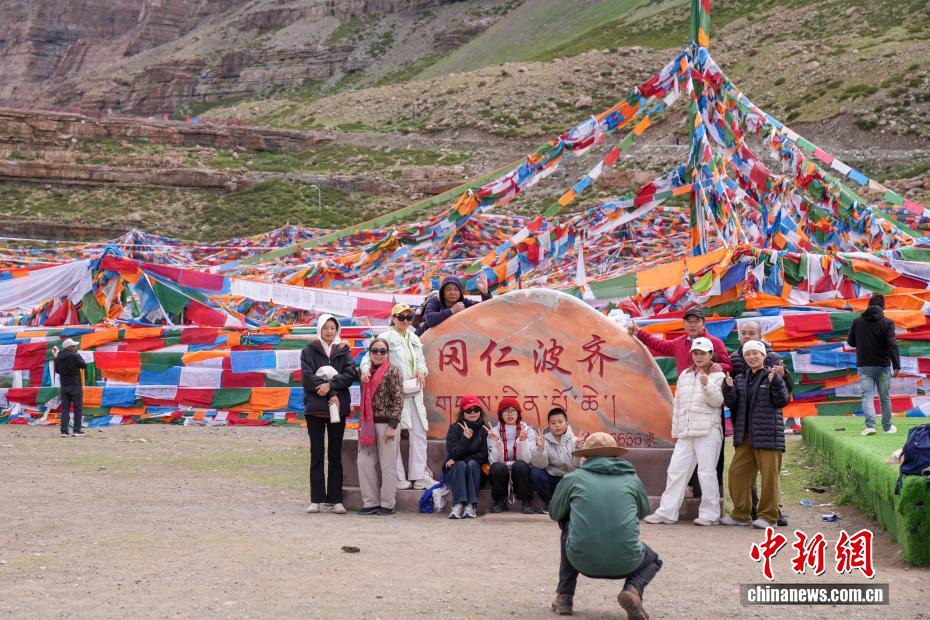 7月21日,游客在岡仁波齊山腳下的經(jīng)幡廣場(chǎng)打卡拍照。岡仁波齊位于西藏阿里地區(qū)普蘭縣境內(nèi),是岡底斯山的主峰,也是藏傳佛教的神山之一,每年吸引眾多信徒前往轉(zhuǎn)山,并衍生出徒步旅行的經(jīng)典路線。每年來自國內(nèi)外的徒步旅行者為當(dāng)?shù)貏?chuàng)造就業(yè)機(jī)會(huì)的同時(shí),也推動(dòng)了文旅產(chǎn)業(yè)的發(fā)展。中新社記者 張祥毅 攝
