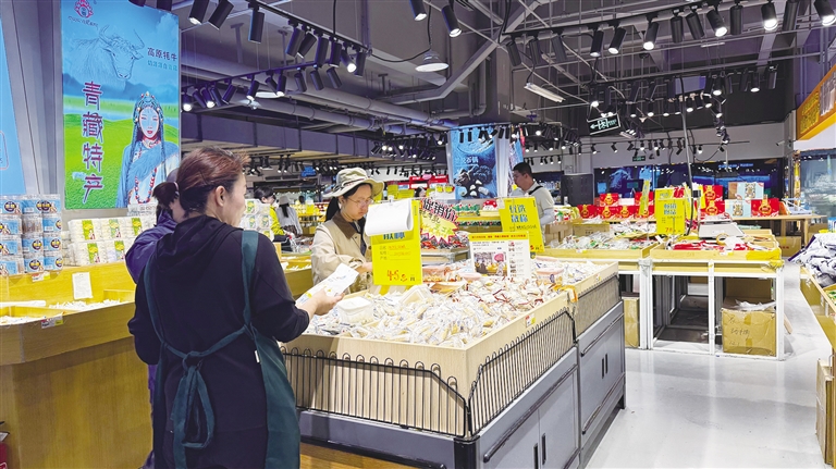 除了家電賣場,特產(chǎn)超市也迎來了消費熱潮。在位于拉薩市濱河路乃倉廣場負一樓的藏匯倉·西藏特產(chǎn)倉儲超市(乃倉總店),前來選購特產(chǎn)的消費者絡繹不絕,貨架前時常排起長隊。該超市負責人李紅容笑著說:“今年上半年的客流量和銷售額都比去年同期上漲了不少,像牦牛肉干、藏香、青稞制品這些特色產(chǎn)品特別受歡迎。一方面是本地市民買回去自己吃或者送給外地朋友;另一方面很多游客也會專門過來采購,把西藏的味道帶回去?,F(xiàn)在物流方便,我們還開通了快遞直發(fā)服務,不少消費者在線上下單,店里的線上訂單量每個月都在增加。為了滿足消費者需求,我們還增加了產(chǎn)品種類,光是青稞制品就有青稞餅干、青稞麥片、青稞酒等二十多個品種。”